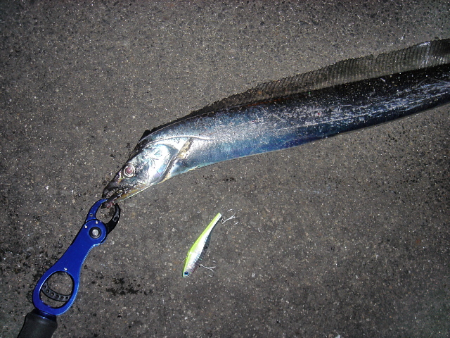 4突堤近くのO浜でメーターオーバー(ゆび4本半)1匹、90cm指3本クラス2匹でした。今さっき刺身とから揚げ骨せんべいといろいろ楽しみました。美味しかったです。ただ、今日は2回ラインブレイクがあり、その中でもワイヤーリーダーごとひったくっていったわけのわからない魚が気になっています。タチウオやったんでしょうか?今度はリベンジします。