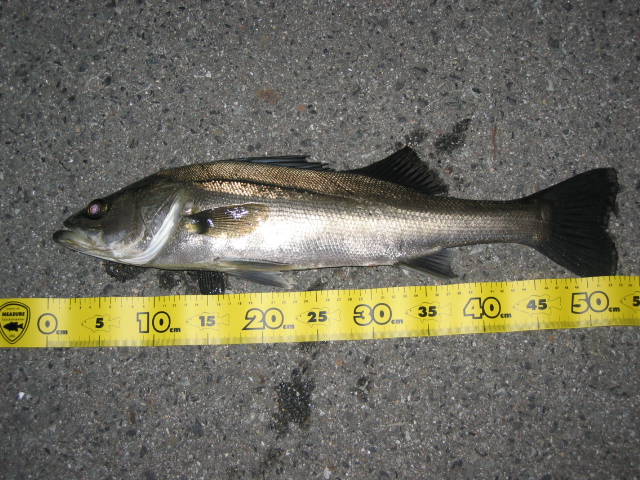 ラン&ガンで岸壁際、台船際、オープンエリアを攻めるも反応なし。。。。(( T_T)トボトボと皆の所へ戻ると、いしかわ氏が『釣れましたヨ!52cmと28cm v(=∩_∩=) ブイ!!』