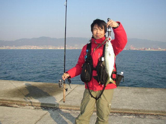 唯一のアタリ、貴重な魚をタモですくって、45cmのはぐれハマチでした(^o^)