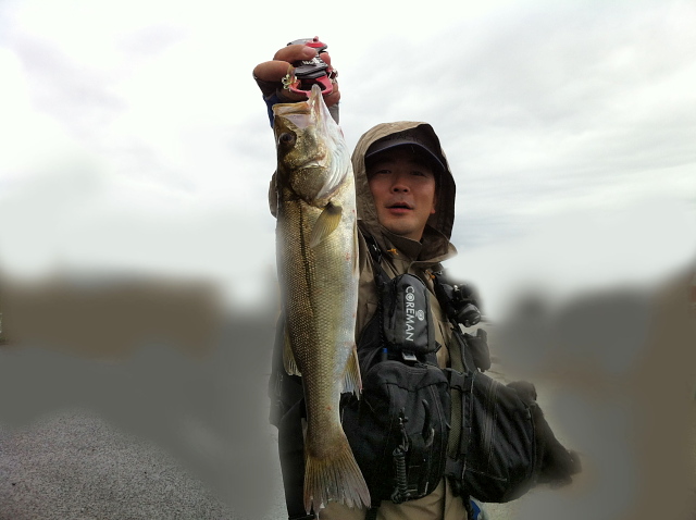 スマホの天気図と、ラジオからの警報を聞いて向かったのはポイントH...パラパラと小雨は降っているものの釣りはできそうな空模様。キャストを始めると左にルアーマンが...『こんな天候でも、好きなヤツ(バカ)は居るもんやな...』と、よーく凝視すると、ミヤマンとイシカワ氏やないの( ̄∇ ̄;)ハッハッハ